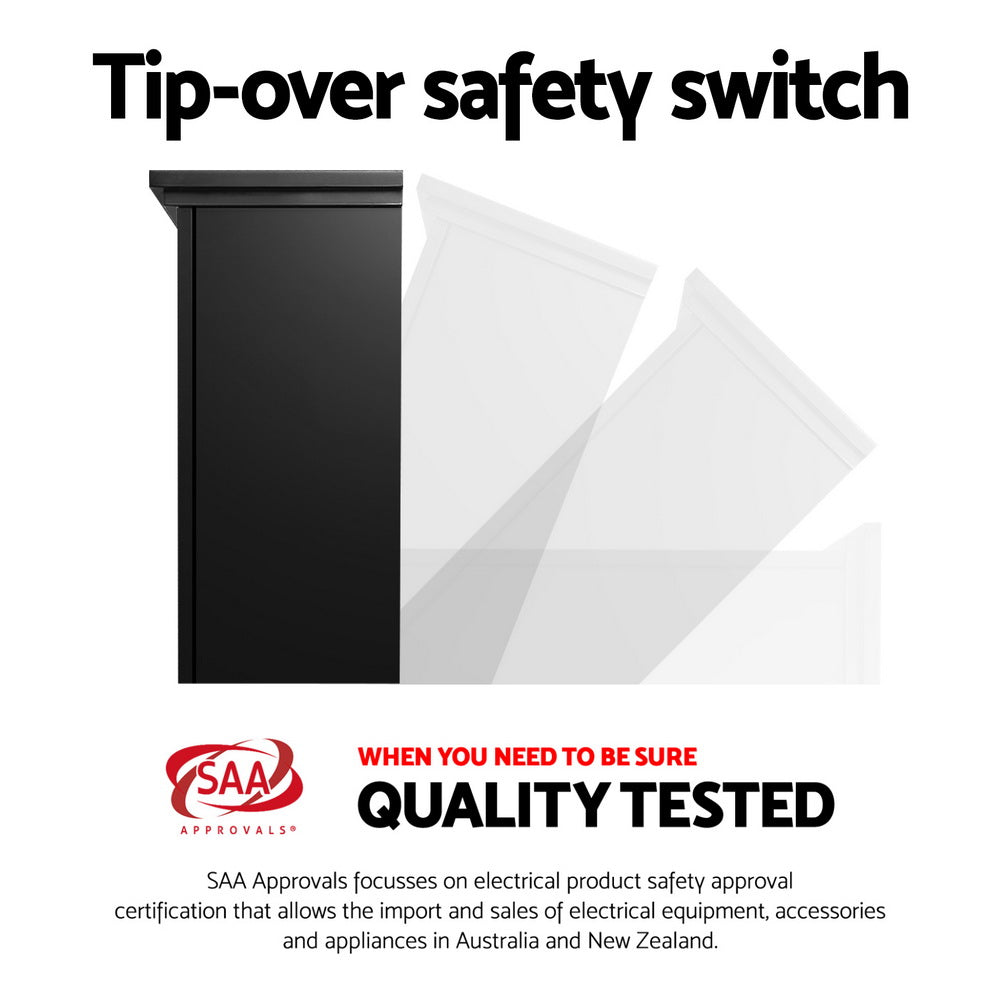 Old world charm with a modern touch. The Devanti Electric Mantel Fireplace delivers dazzling warmth with radiant glows. With its classic design, the mantel fireplace captures the mood of a traditional fireplace with a contemporary update. More importantly, the aluminium heating elements actually helps to maintain natural humidity in the air for comfortable heat without drying out the room air. The heater heats up rapidly and uses over 90% less energy than gas for better costs savings. Good all-round heating is also ensured with the fan-assisted heated air circulation. And if flickering flames are a must, our fireplace provides a 3D flame effect with glowing embers for a totally authentic presence. Constructed of MDF board with a black tempered glass casing, the fireplace is strong and durable. Convenient adjustments from the handy remote control include four flame brightness setting, high/low heat settings, nine-hour timer setting and thermostat for the desired warmth and ambience. The fireplace features overheating protection, auto shut-off and no worries about carbon dioxide emissions, odours or fumes from traditional fireplaces.