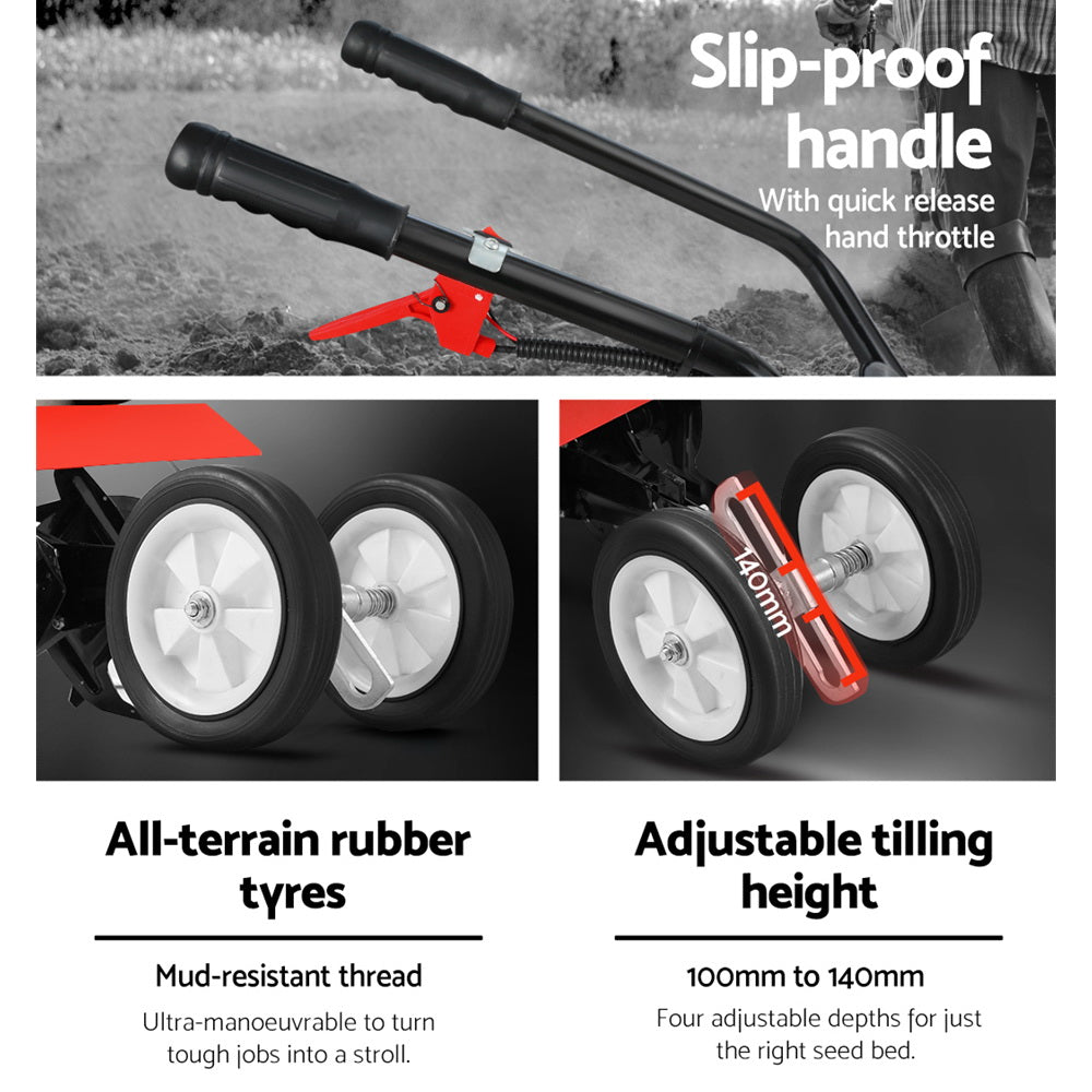 Get the earth moving quick and easy with the GIANTZ Hand-held Tiller. Featuring a 88cc 10,000rpm 2-stroke petrol motor, the tiller churns out soil deep and wide with its 16 teeth of hardened steel tines. The four blades allows you to till an extra-wide swath of 400mm and up to 150mm in depth. In other words, you only need one pass with the tiller to pulverise the soil and get the right seedbed for your favourite crops. Operating the tiller is just as easy with its pull-start improved engine, steady handle and quick-release hand throttle control and all-terrain rubber tyres to transform back-breaking tilling work into a ground-breaking stroll. And when the tilling is done, just fold away the tiller and store with the rest of your tools. Ideal for the home gardener or small-scale commercial grower.