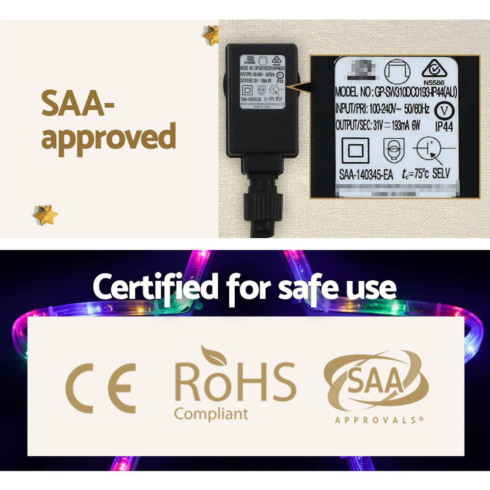 Bring the brilliance of Christmas to your home with our mesmerising Jingle Jollys LED Christmas Tree. A rope light with 36 multi-coloured LED bulbs per metre spirals up the tree-shaped metal frame to the star on top. The LED bulbs flash brilliantly to light up your festive spirit, and you can adjust the speed to suit your preference. The 8m long power cable gives you more flexibility on where you can set up the tree. Place it indoors in your living room, or outdoors in the front yard for all your neighbours appreciate. Create a lively and bright Christmas ambience throughout the season.